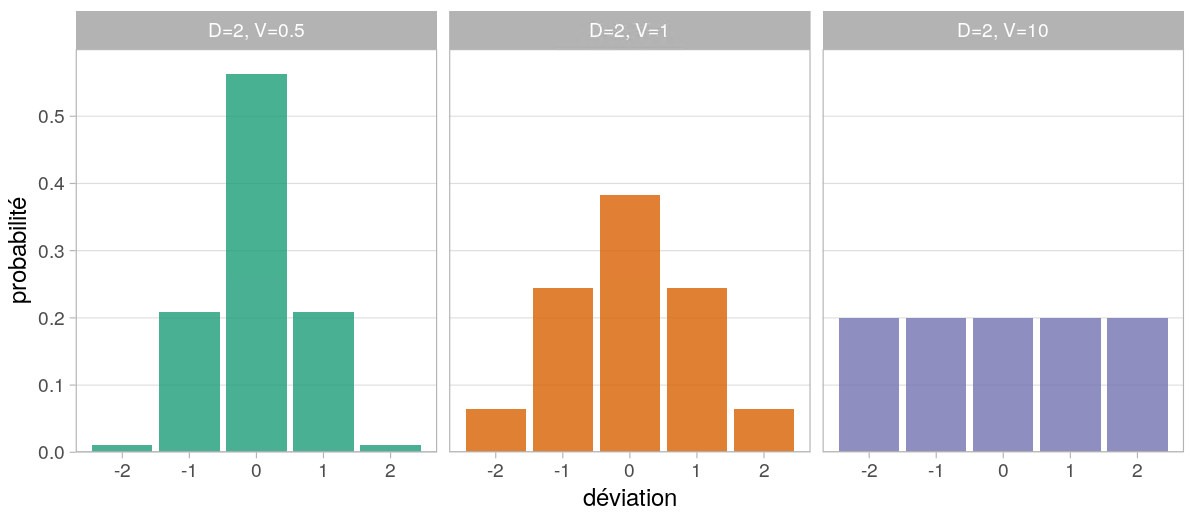 Figure 1: Distributions de probabilités pour \(D=2\) et trois valeurs de \(V\) (cas général où \(X = i \geq 2\))