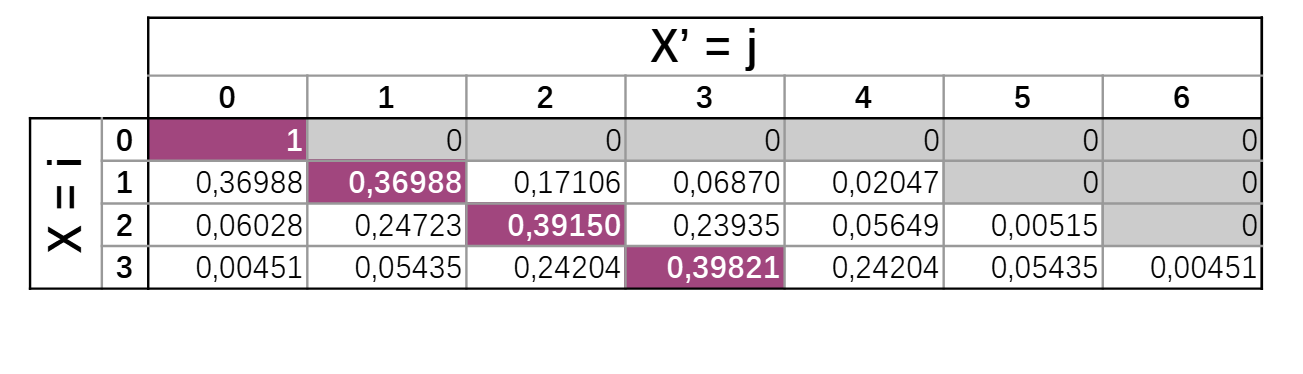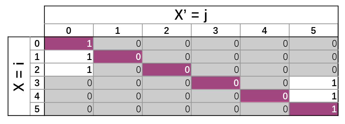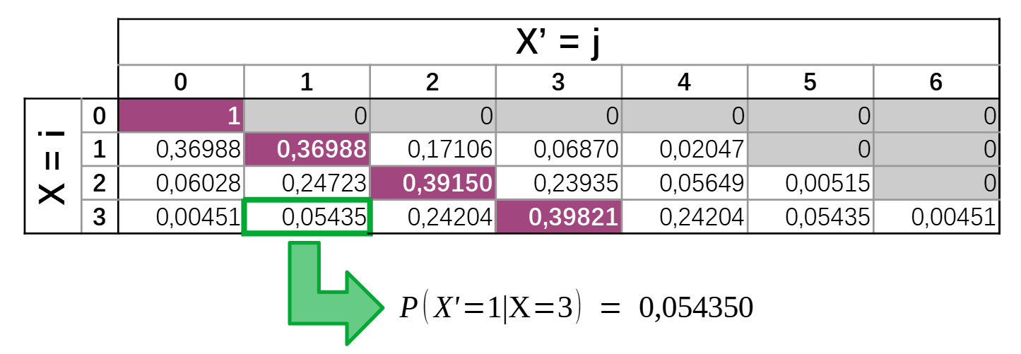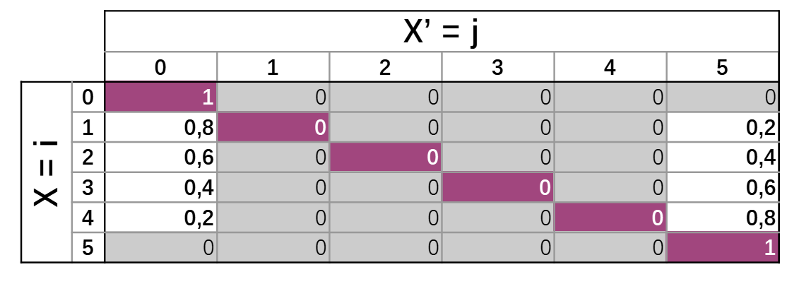 On cherche à déterminer les \(p_{ij} = \mathbb{P}(X'=j|x=i)\) avec: